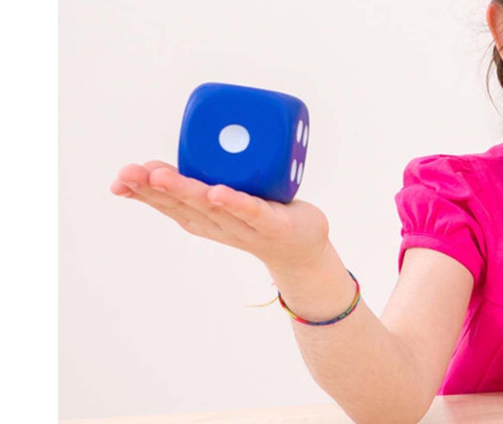 Die Kinder lernen spielerisch, auf dem Tisch zu würfeln. Speziell die Größe der Augen erleichtert das Erkennen. D