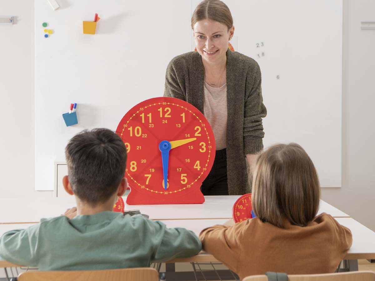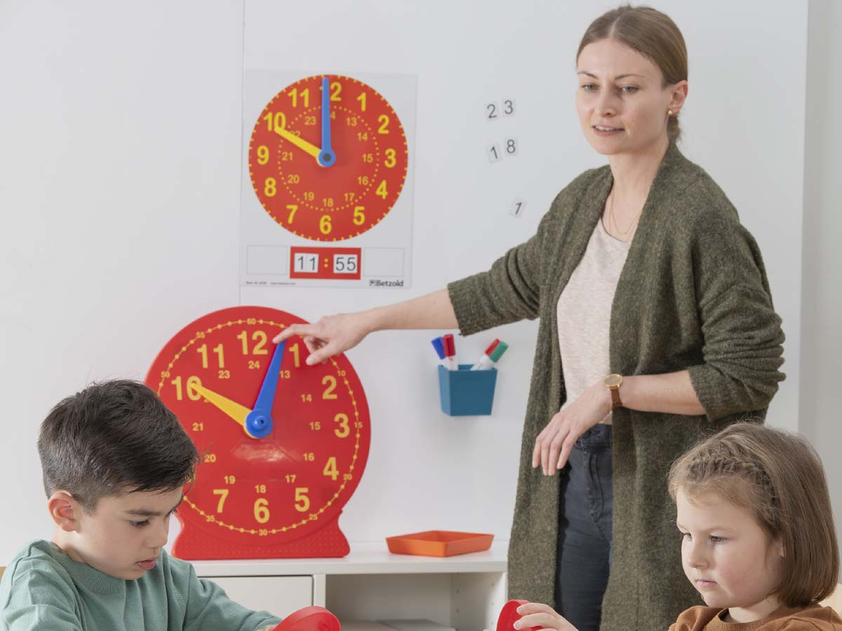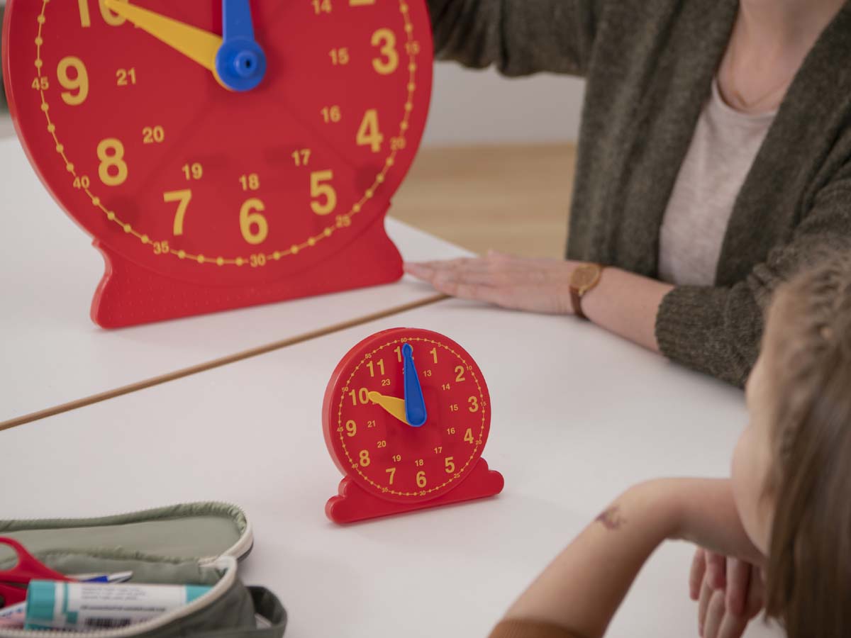 Mit diesem Set aus Lehreruhr und Schüleruhren können Sie optimal einen anwendungsorientierten und abwechslungsreichen Unterricht gestalten. Das Stativ zum Aufstellen der Schüleruhren lässt sich einklappen, so kann die Uhr auch auf das Schülerheft gelegt und im Schulranzen mitgenommen werden. Selbstverständlich befindet sich in jeder Schüleruhr ein Zeigerwerk aus Zahnrädern, damit die Zeiger synchron laufen. Die Zeiger können mit einem kleinen Drehrad an der Rückseite der Uhren individuell verstellt werden.