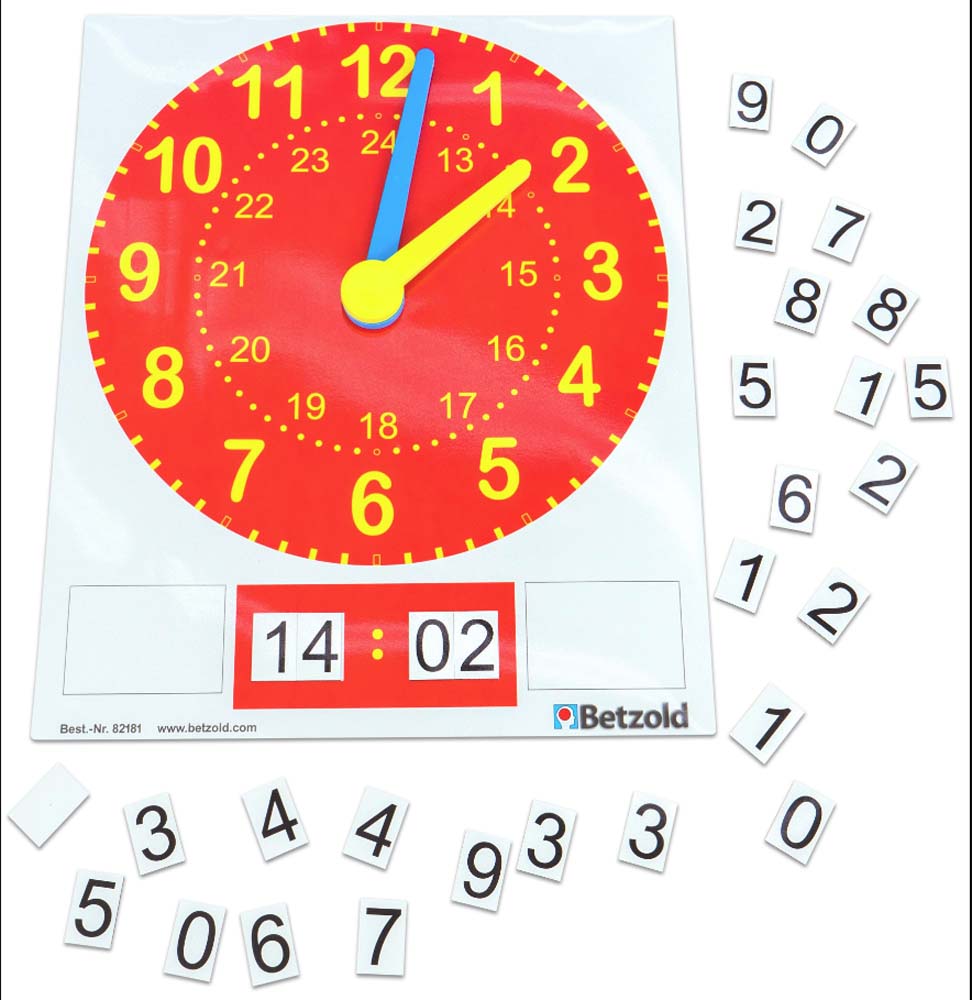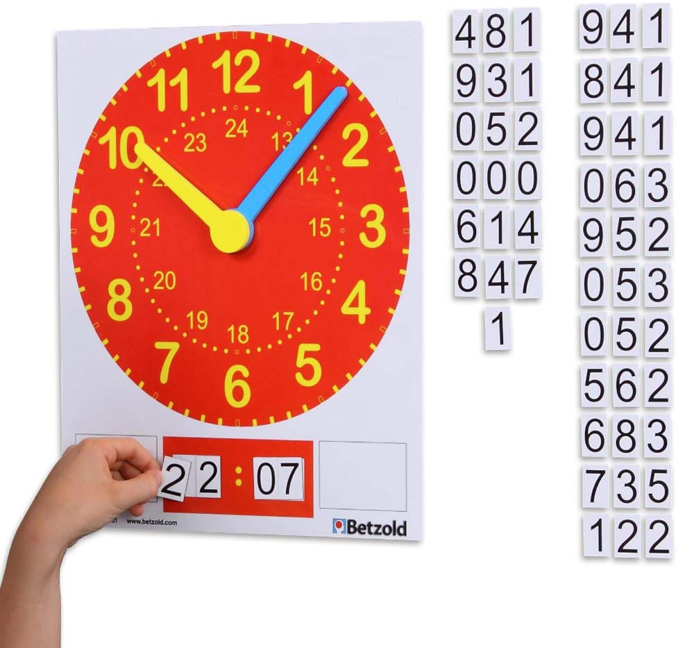 Dieses Klassenset aus 25 kleinen Schüleruhren und der magnetischen Tafeluhr ist das ideale Demonstrationsmaterial, um die Uhrzeit kennenzulernen.