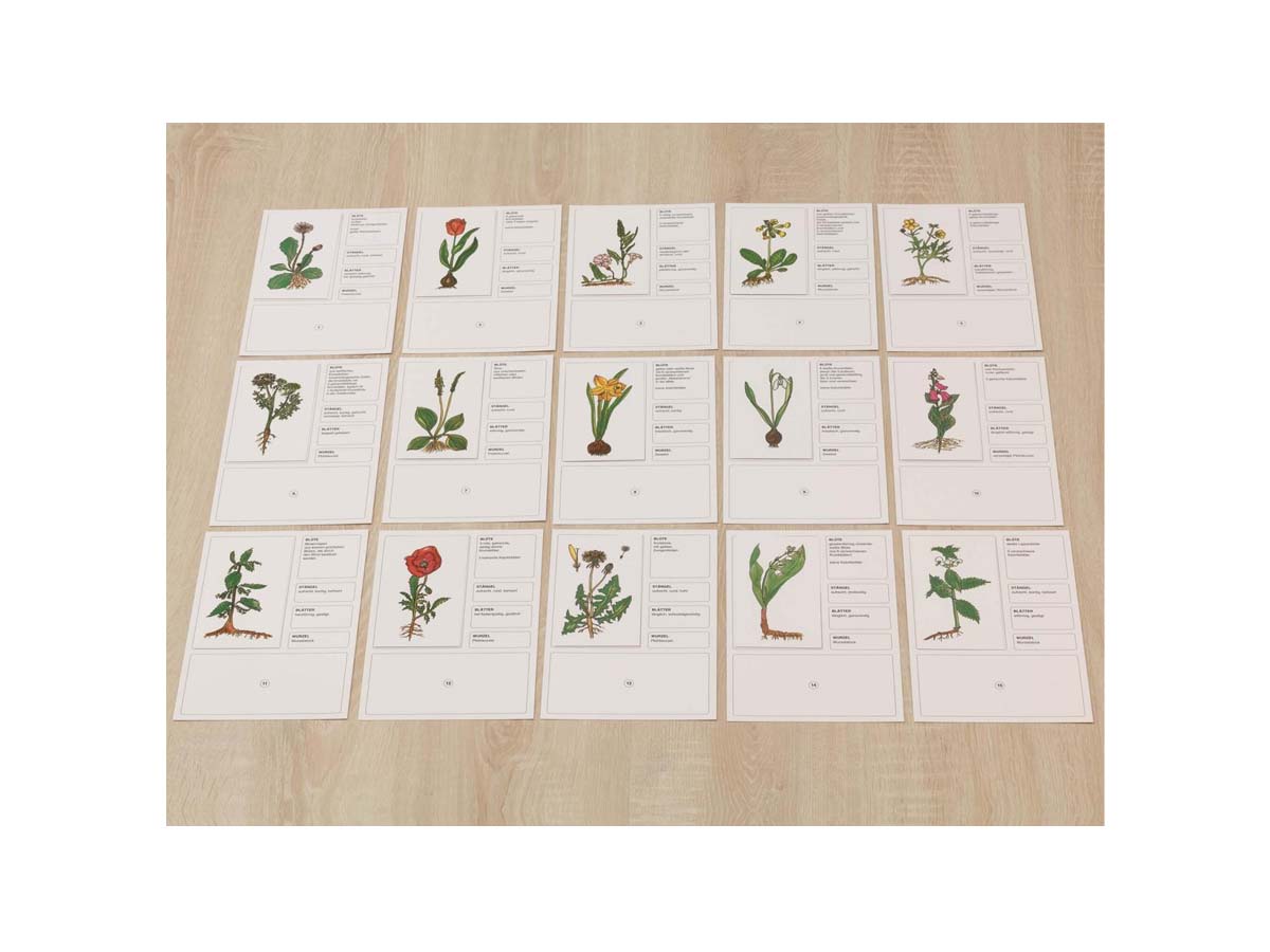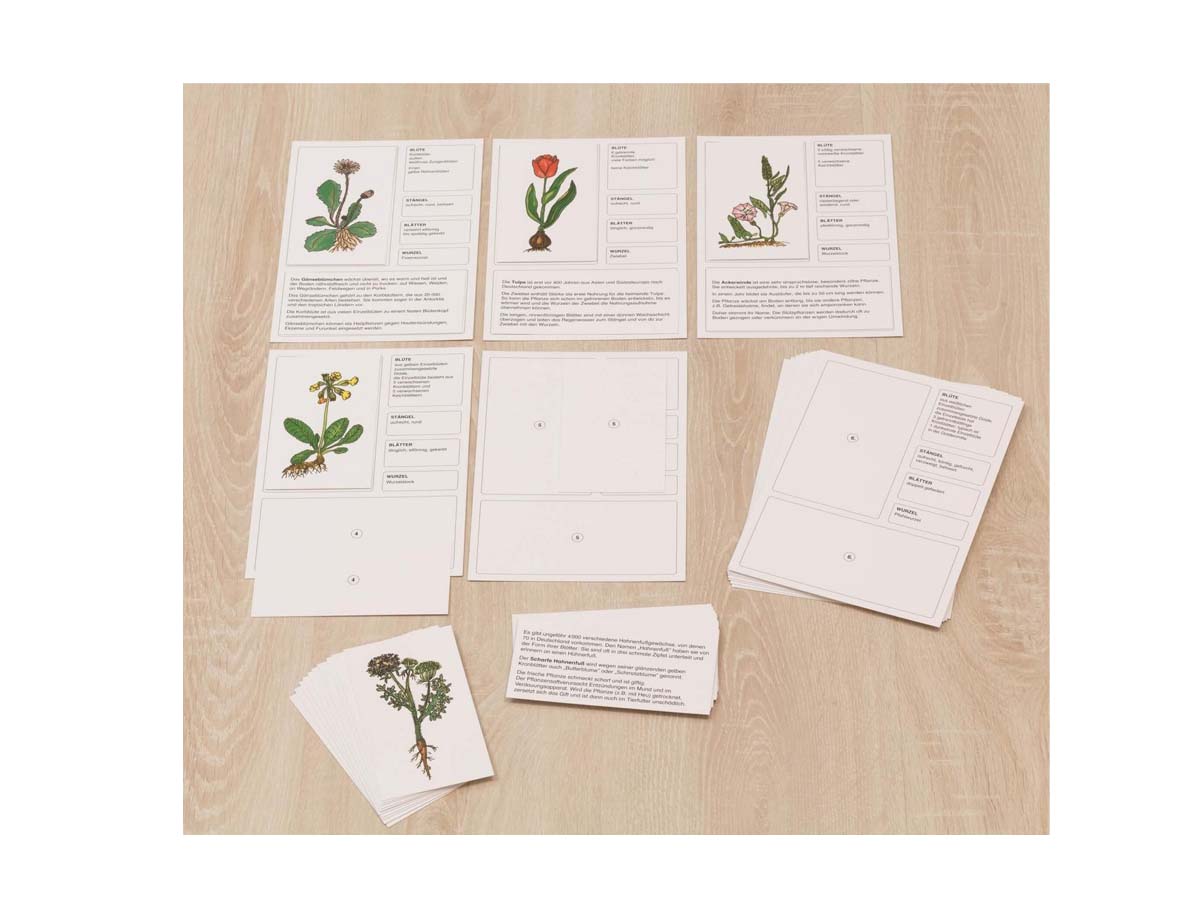 Zu jeder der 15 Pflanzen gehört eine Textkarte, die zusätzliche Informationen gibt, z.B. zu Pflanzenaufbau, Standort, Verbreitung, oft auch die Bedeutung als Heilpflanze. Dass die Schüler häufig schon einige der hier ausgewählten Pflanzen kennen, erleichtert die richtige Zuordnung der Textkarten. Die Texte unbekannter Pflanzen können zum Schluss mit Hilfe der Kontrollzahlen zugeordnet werden.