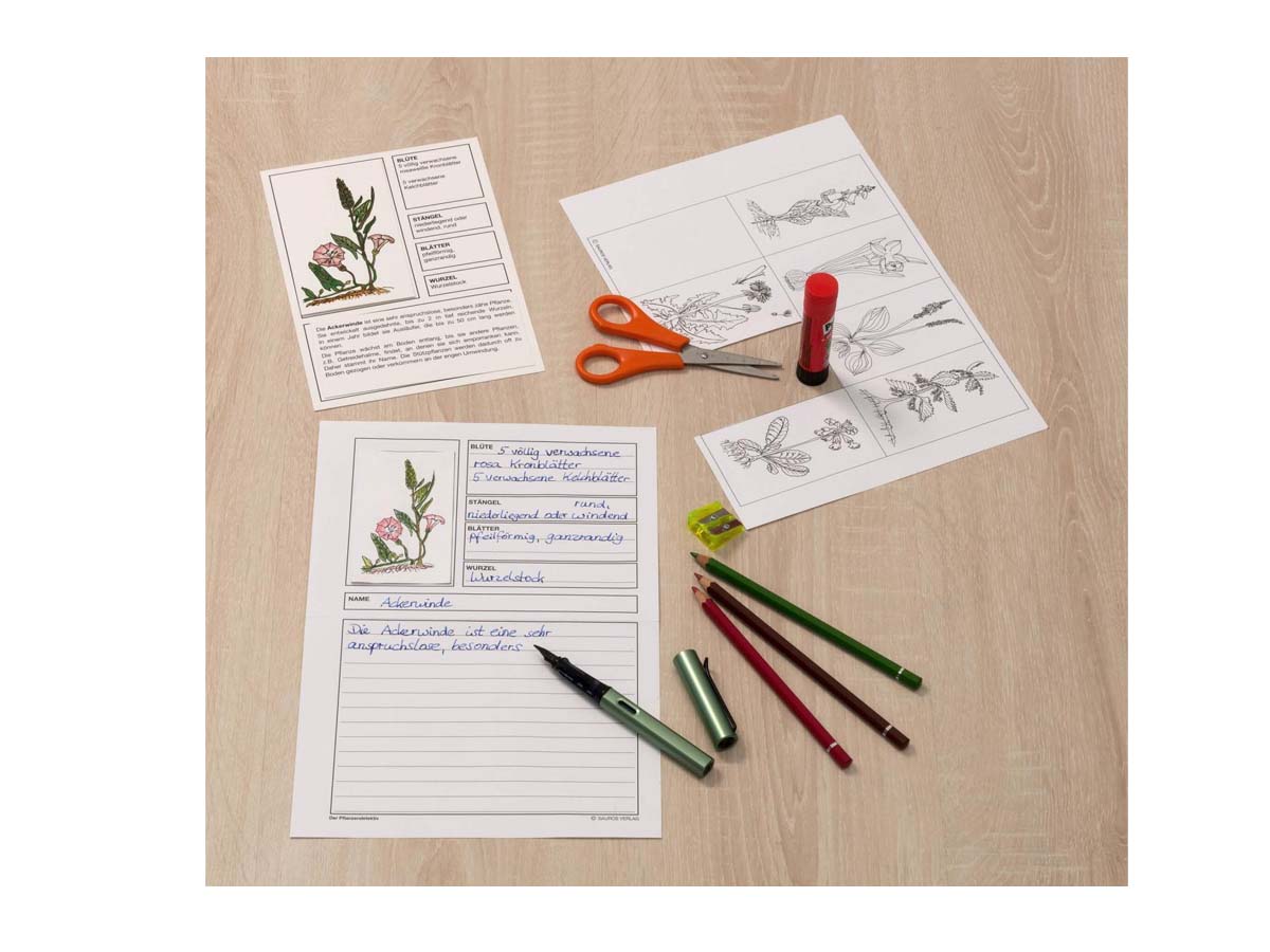 Eine genaue, steckbriefartige Beschreibung hilft ihnen bei der Suche. Ein erster Hinweis auf die gesuchte Pflanze ist die Beschreibung der Blüte (Farbe und Form). Damit verengt sich die Zahl der infrage kommenden Pflanzen. Eine weitere Eingrenzung ergibt sich aus der Wurzelbeschreibung. Danach helfen Stängel- und Blattbeschreibung, schließlich die Pflanze herauszufinden, auf die sämtliche Angaben im Steckbrief zutreffen. Mit Hilfe der Kontrollzahlen können die Kinder selbstständig überprüfen, ob sie die richtige Pflanze gefunden haben.