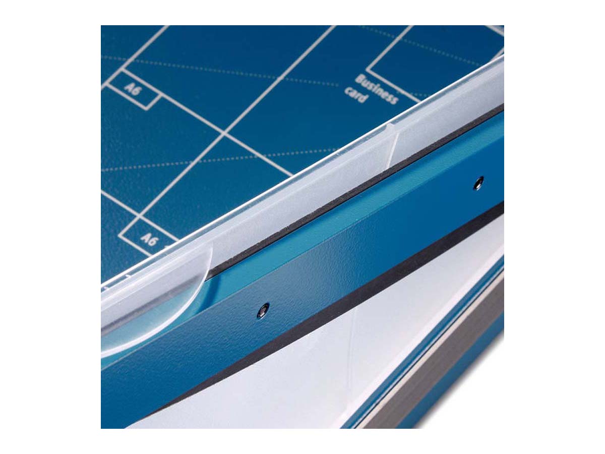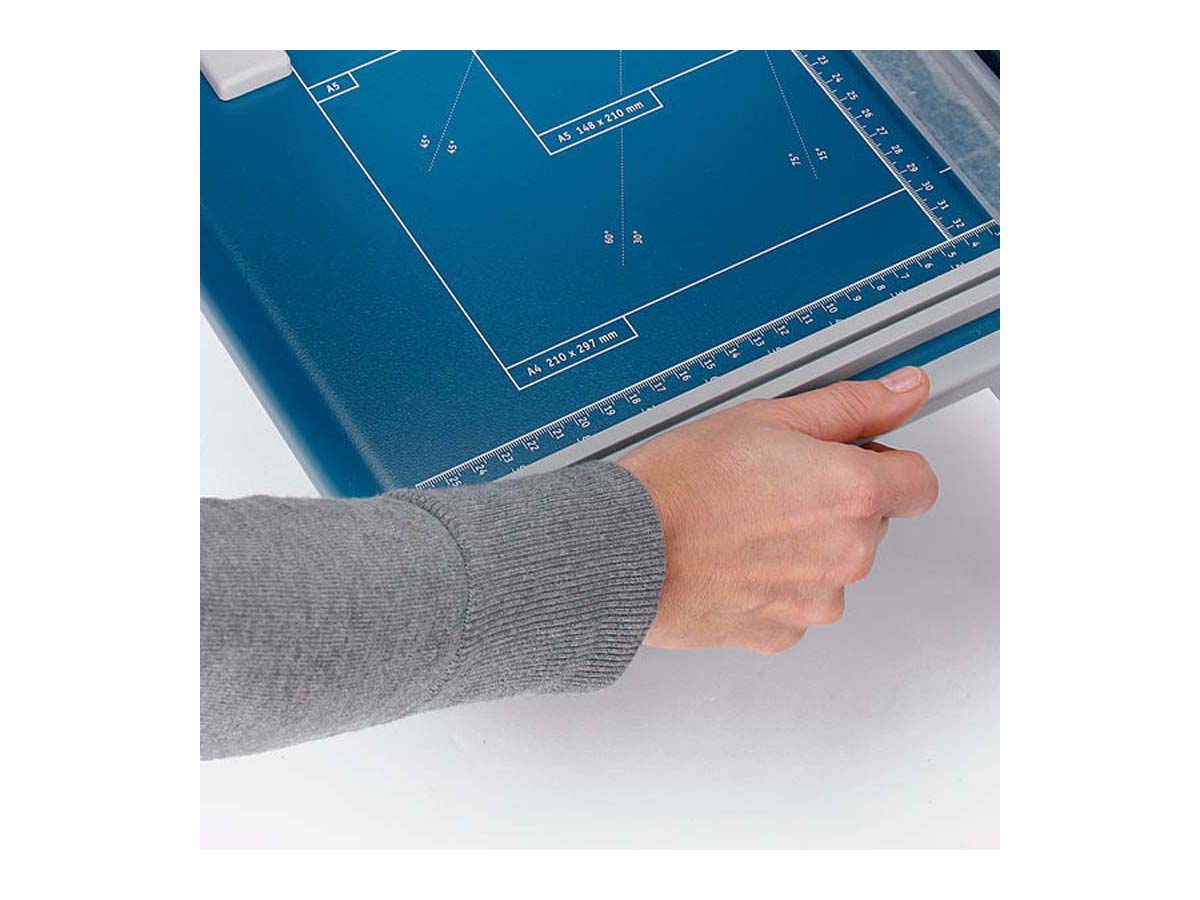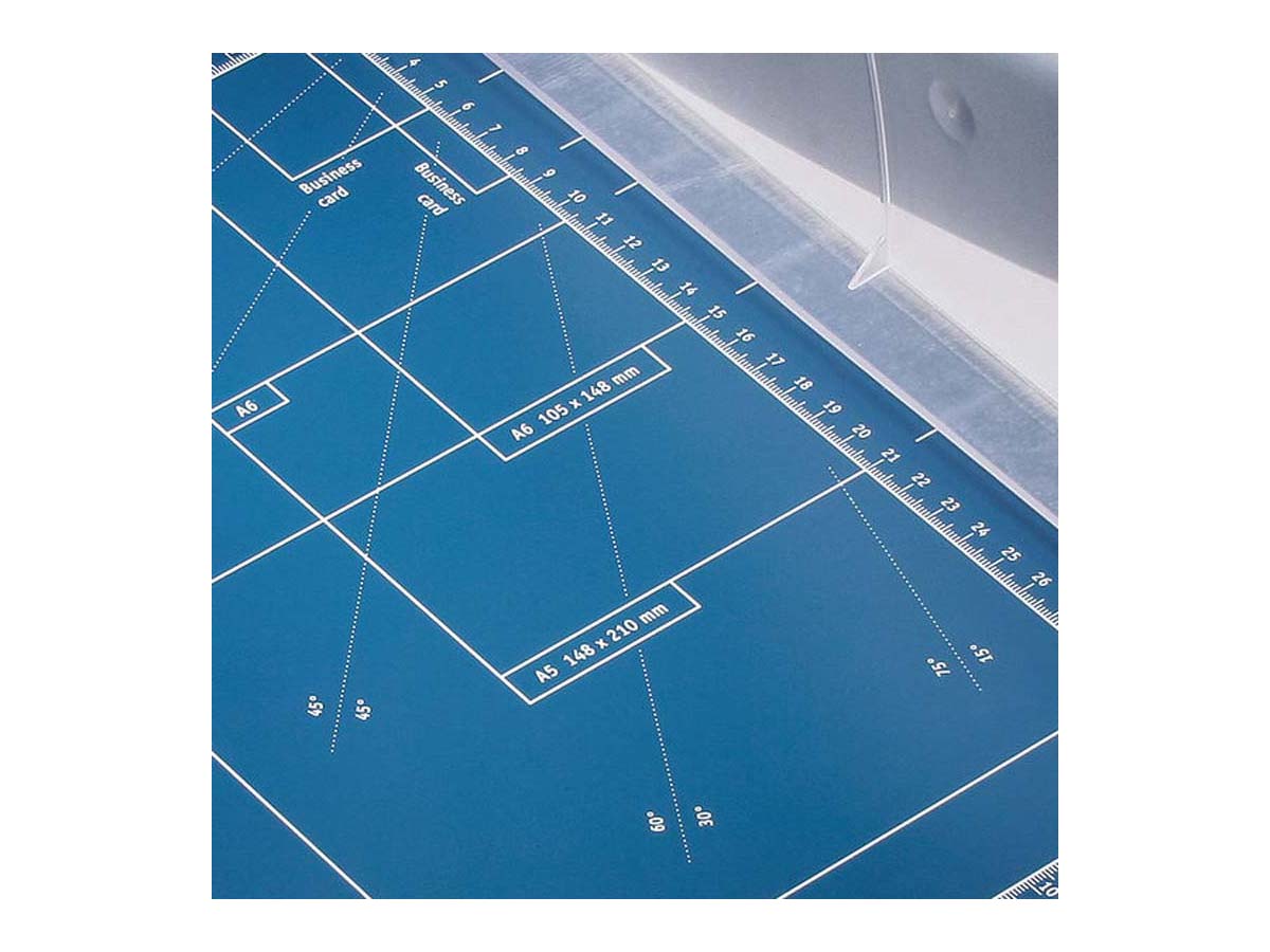 Tischgröße: 443 x 285 mm Schnittlänge 340 mm Schnitthöhe 2,5 mm Schnittleistung A4 80 g/qm 25 Blatt
