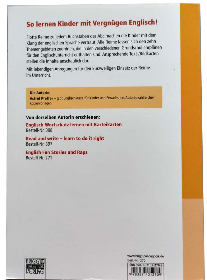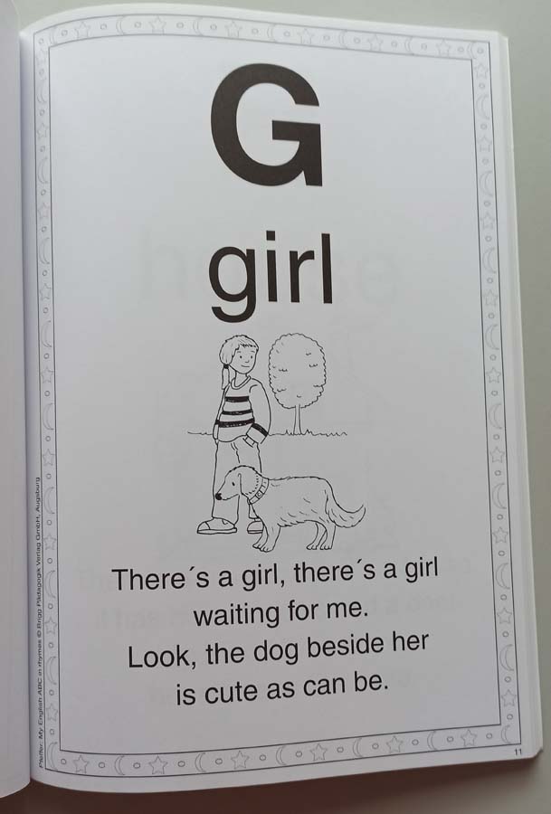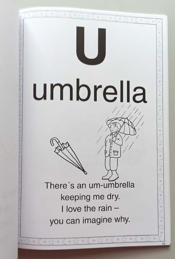 Jedem Buchstaben sind ein typisches englisches Wort und ein dazu passender vierzeiliger Reim zugeordnet. Diese Reime lassen sich leicht einprägen und machen mit dem Klang der englischen Sprache vertraut.