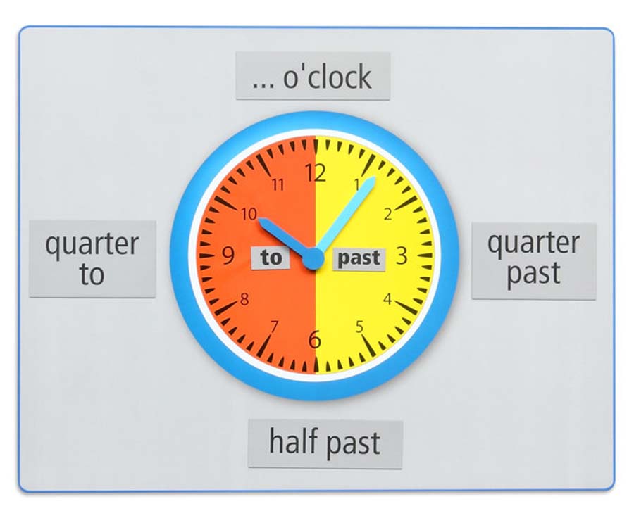 Die beiden Zeiger sowie die magnetischen Schildchen mit Zeitbegriffen sind flexibel einsetzbar. Das ermöglicht Ihnen einen einfachen und anschaulichen Einstieg in das Thema Zeit.