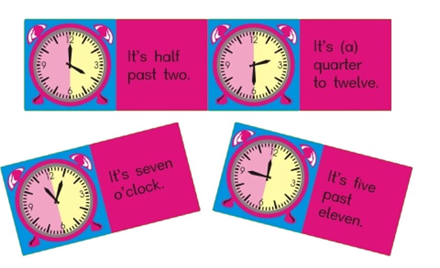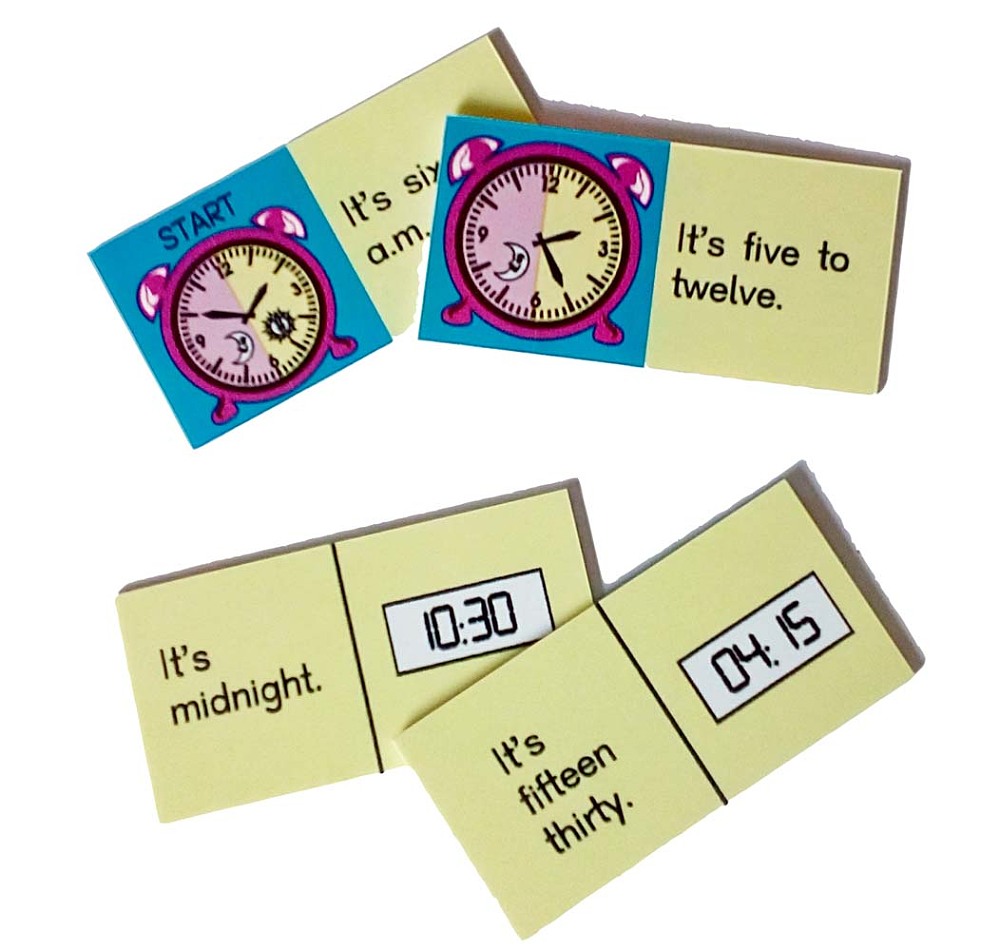 Zweimal 16 Dominokarten aus Kunststoff mit Übungen auf der Vorder- und Rückseite mit Uhrzeitangaben und entsprechenden Zeigerstellungen auf den Zifferblättern. Zwei Übungen mit digitalen Zeitangaben und Aussprache befinden sich auf der Rückseite. Kontrollmöglichkeit durch vorgegebene Start- und Zieldominokarten. Ein Lösungsblatt wird mitgeliefert.